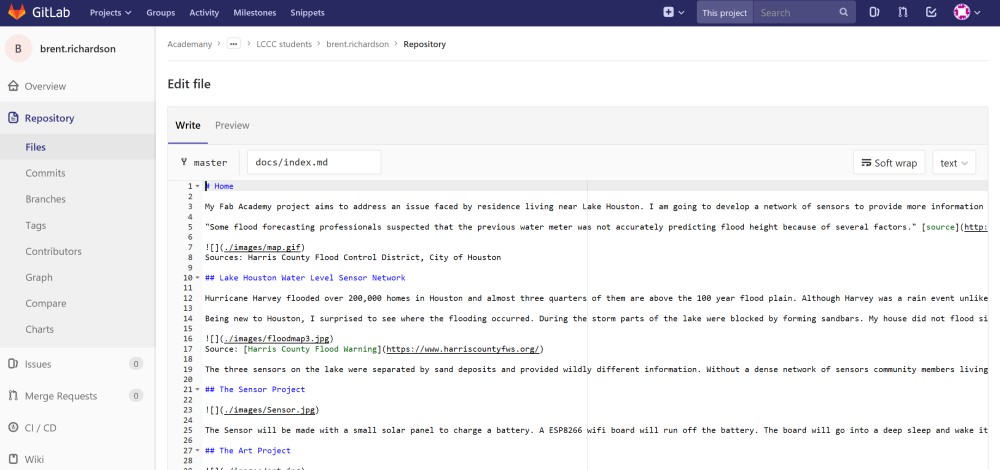I went into the Doc folder opened the index.md file to edit. This file serves as the Home page for my Fab Academy website.