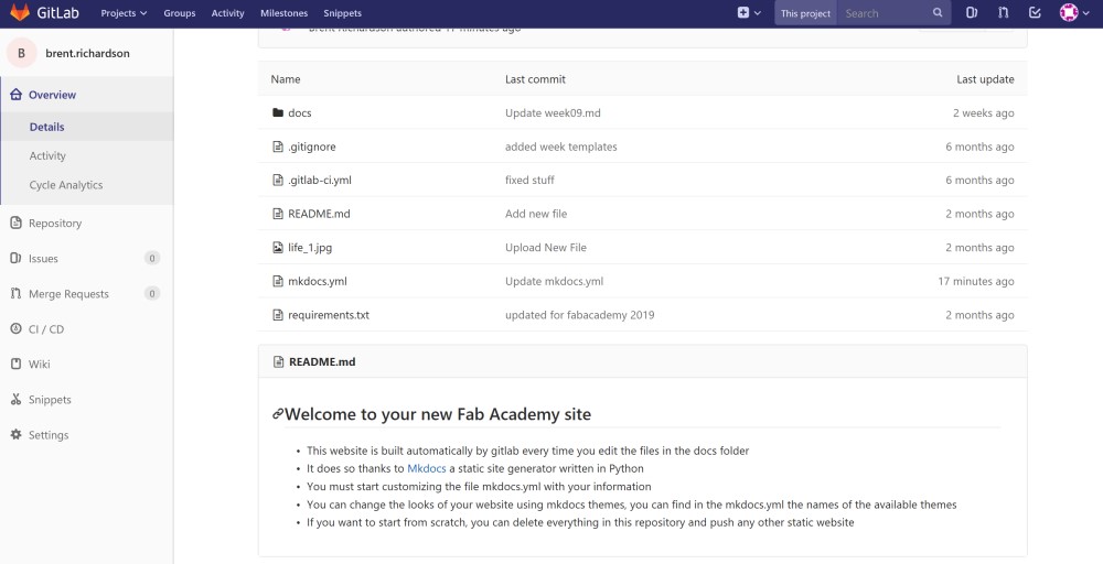 When I first logged into GitLab with my Fab Academy credintials it was nice to have a website template. I really wanted to pracetice my HTML skills that I haven’t exercised in a long time. I spent about 8 hours making the website structure and formatting before I realized it was going to take me 10 hours a week to format the website with basic HTML and CSS.