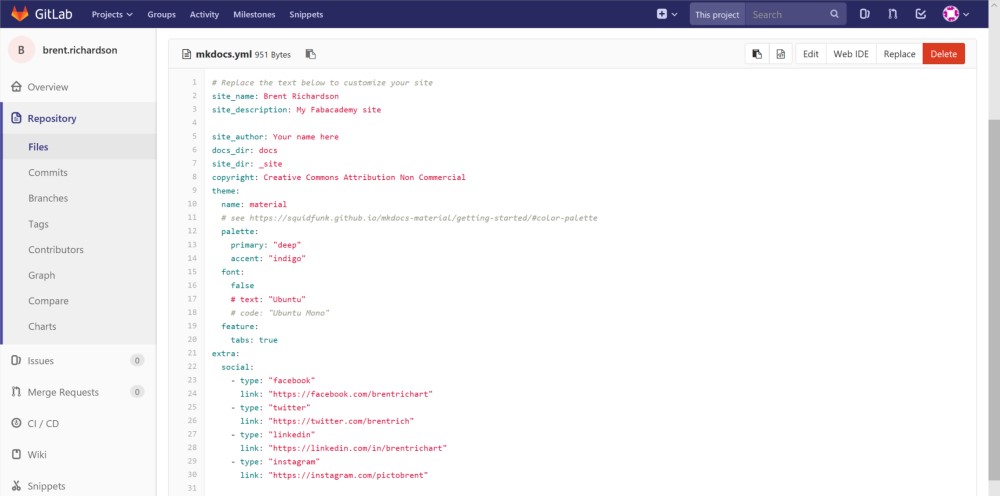 Once I changed the variable content with my information and committed the change. Then, once I made it back to my Fab Academy page and cleared my browser cache the site appeared.