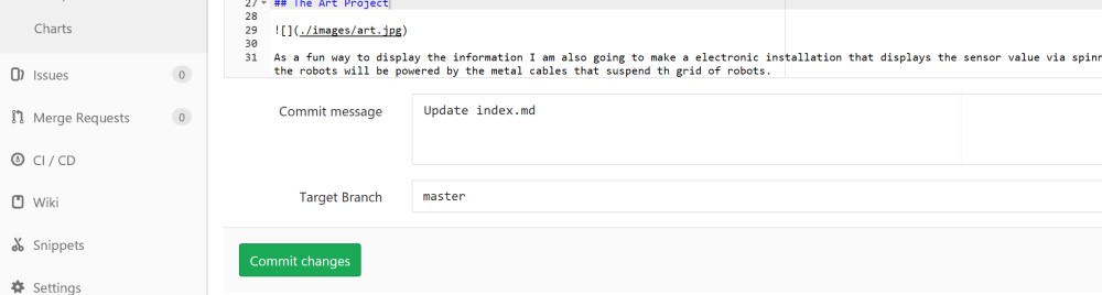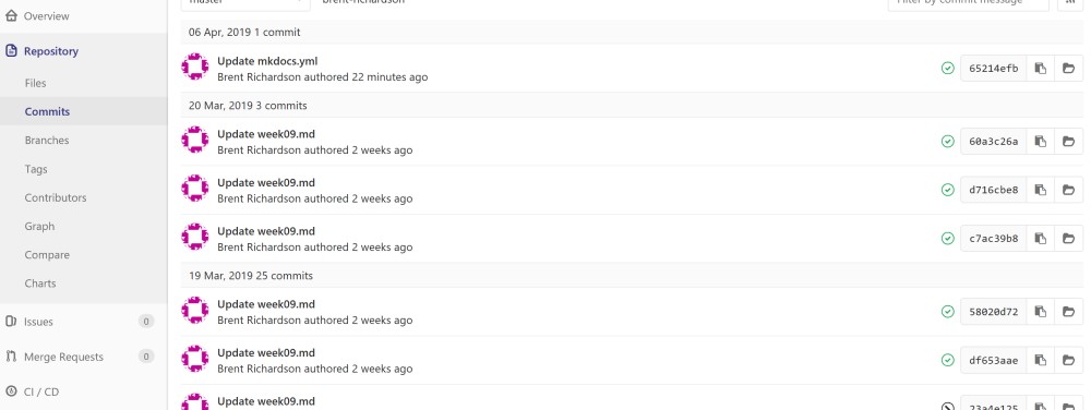 One of my favorite parts about Gitlab is that it logs all changes that are made to the site. By clicking the Commits link on the sidebar it is possible to see all the changes committed to the Gitlab site.