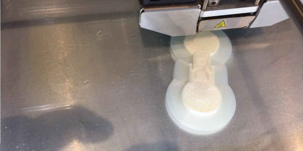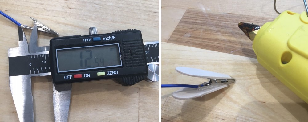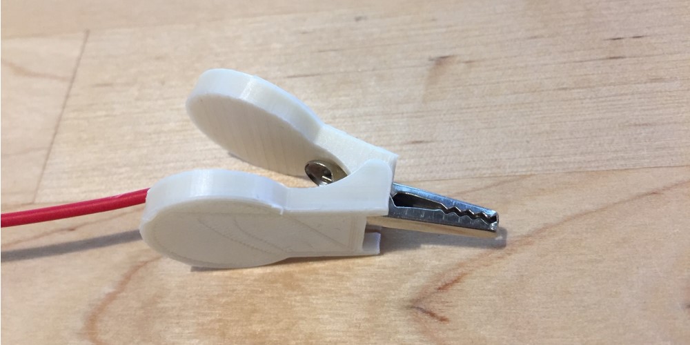 I designed the model in SOLIDWORKS as two pieces with .3mm clearance at the hinge. I combined the two parts into an assembly and exported the assembly as an SLT model. Once taken off the printer bed the two parts hinge perfectly allowing you to insert the alligator clip. This design would be impossible to create with a subtractive mill because of the hinge.
