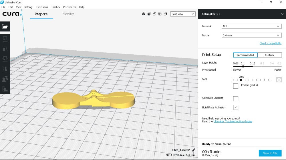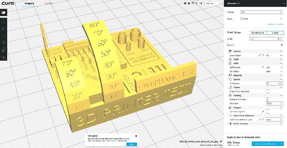 I used the default settings for the Ultimaker. These are the same settings I used in the test above. The file printed in under 1 hour.