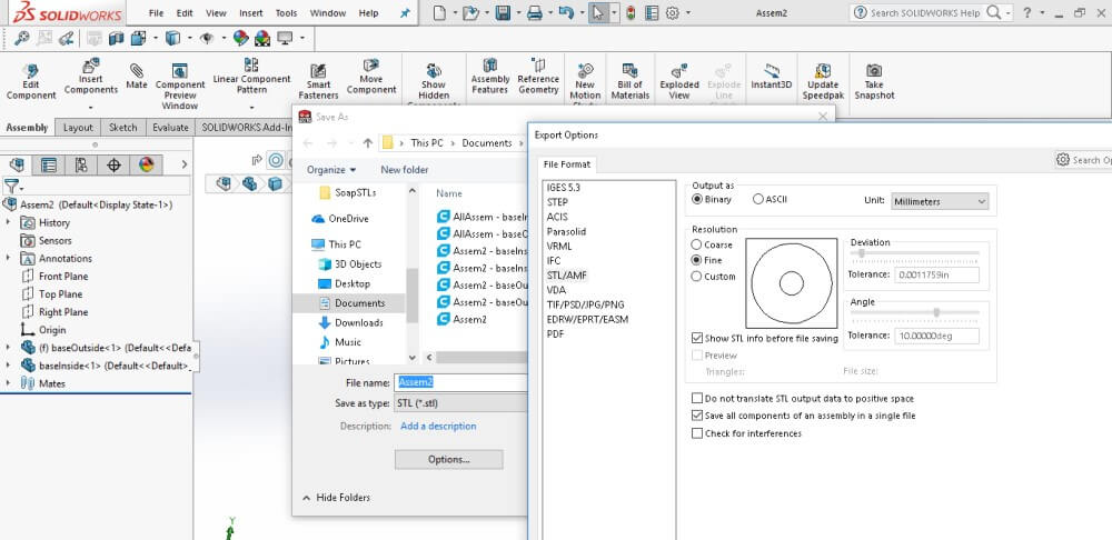 Once the design seemed good I went to save the model and realized that SOLIDWORKS saves assemblies as seperate STL file. After some research I learned that there is an option under EXPORT OPTIONS to “Save all components of an assembly in a single file”. Once that box was checked I had the file to load into Cura to 3D print.