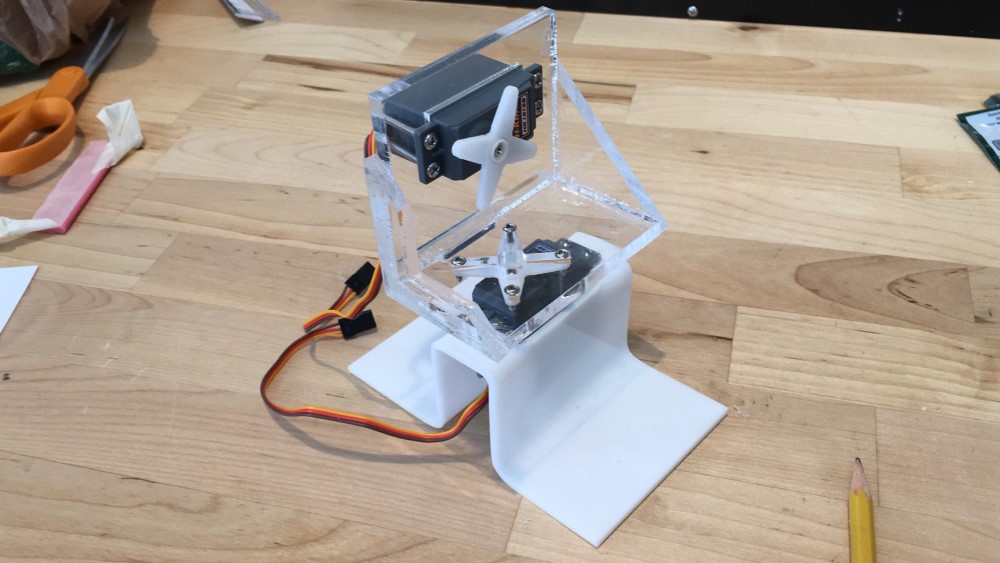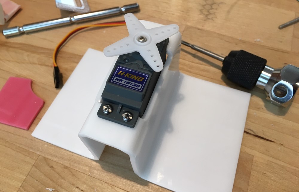 In the tradition of measure two cut once we Neil instructed everyone to move the mechanism manually by hand. This proved to be important for our mechanism too. The servo motors do not rotate freely around and around like a DC motor. Most servo motors will only move to a certain point before the motor binds. By moving the mechanism by hand I could ensure that the motor was faced so the motor would not bind over the the front of the machine. Also, the hammer needs to be able to move far enough down to touch the metal music keys. I cut a slot in the clear acrylic brace to allow the hammer to move all the way down.