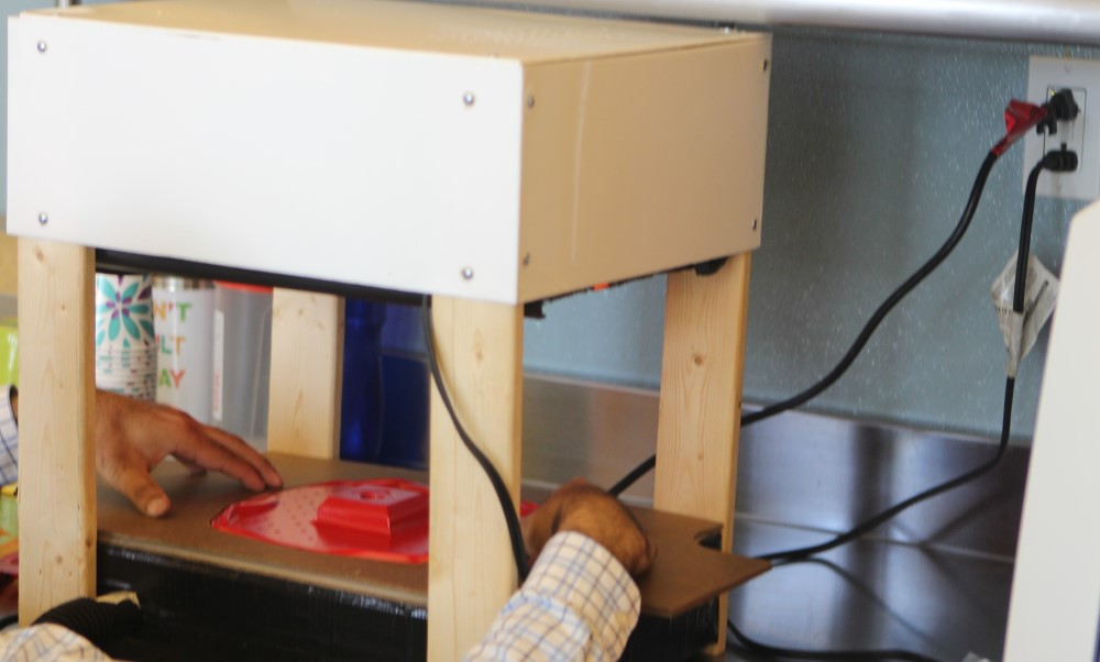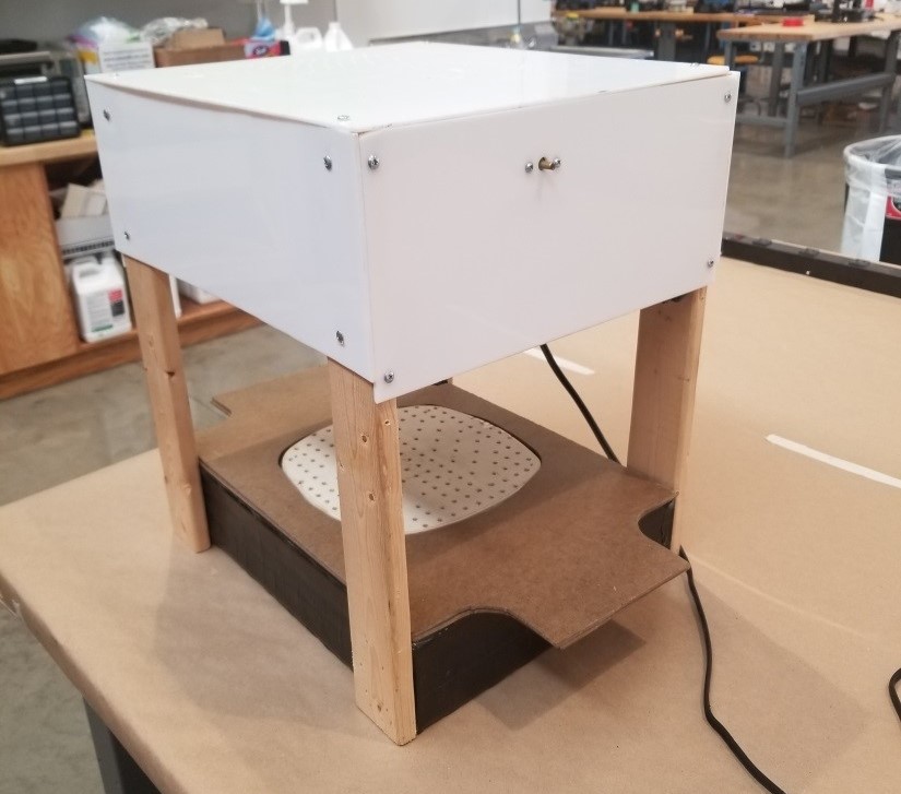 The vacuum forming machine was made using the laser cutter to cut the 1/8” white acrylic and the Shopbot to cut all the wood pieces.