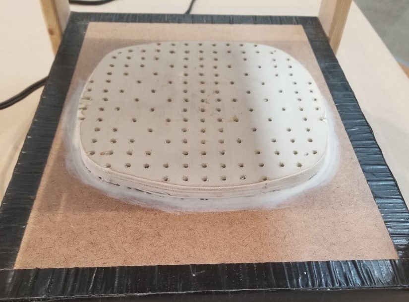 The vacuum table is a simple box made of ¾” plywood with a plate shaped piece of plywood on the top. This shape allows the plate to suction over the edge of the vacuum table with a nice seal. The holes in the top allow the air to pull the plastic against the 3D printed or CNC milled blank.