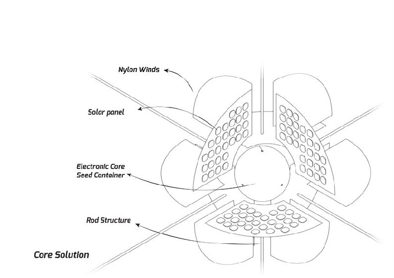 I have just thought, there will be 3 main components, 1. The Core. 3D printing volume with the seeds and the electronics 2. Solar Winds. Nylon fabrics with solar panels to charge the correct 3. The Skeleton. Light materials for the “wheel” structure