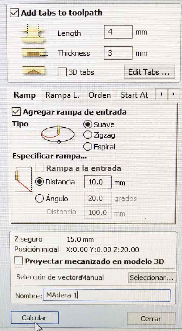 - It is highly recommended add tabs. This is useful when you are cutting the outside paths and you want you piece good fixed. If you don´t fixed your pieces they could be very dangerous for your machine and for the security