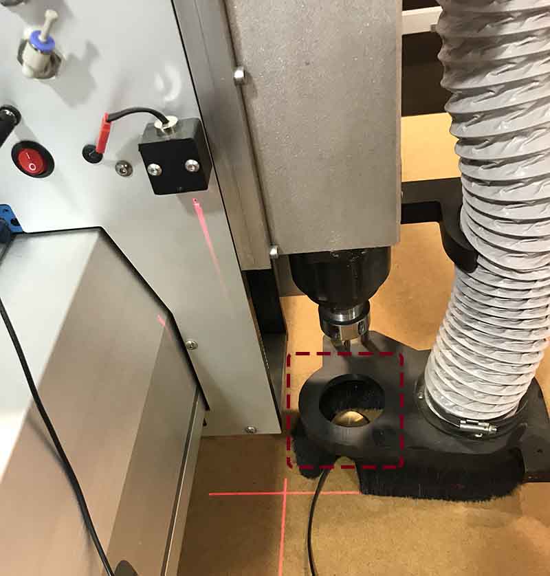 Now its the turn to say to the machine where is the XY origin. In this model we have 2 options: One with the control panel putting the mill in the corner of the wood panel; Second we use the laser reference. This is the option I have used. Just go with the laser cross to the corner and fix it with the button laser origin