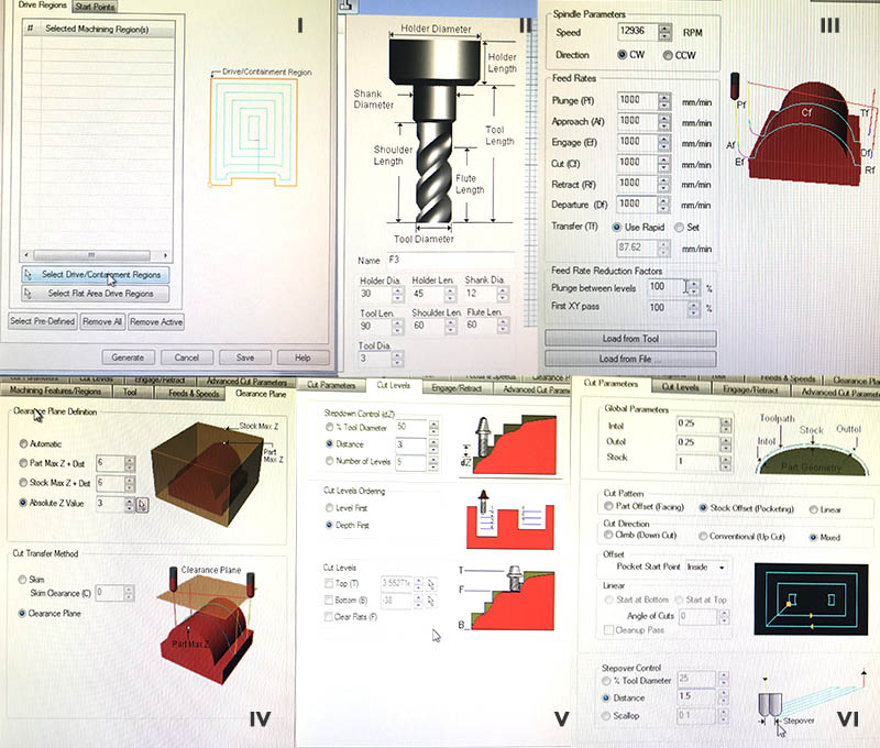 I - Select the working Area II - Select the correct Tool (universal 3mm tool) III - Select the speed of movements (1000 mm/min) IV - Select the high for the z axes movements V - Select depth of each step in the block VI - Select how will be the roughing of the mill