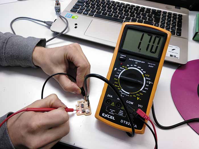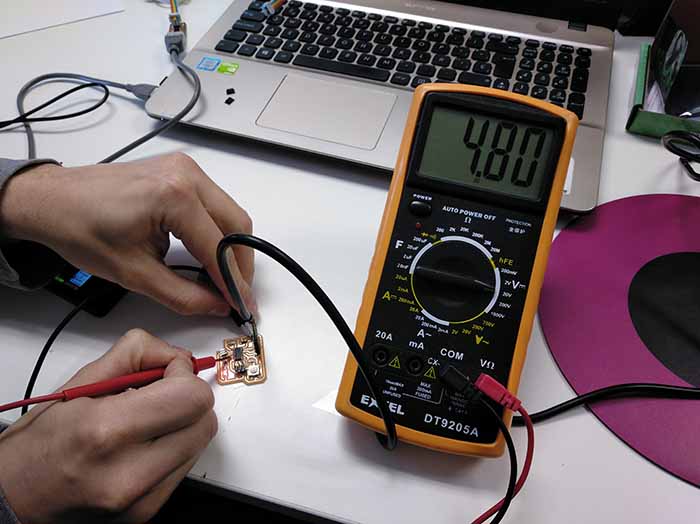 In this case all the remote students have been together to measure the power consumption of the PCB Hello Board. We loaded a sketch that makes the LED to turn on/off when you press the button and we supplied the PCB from the computer. Then, using a multimeter, we measured the voltage when the LED was on (4,8V) and off (0,0V). We also measured the consumption after the resistor (1,7V).
