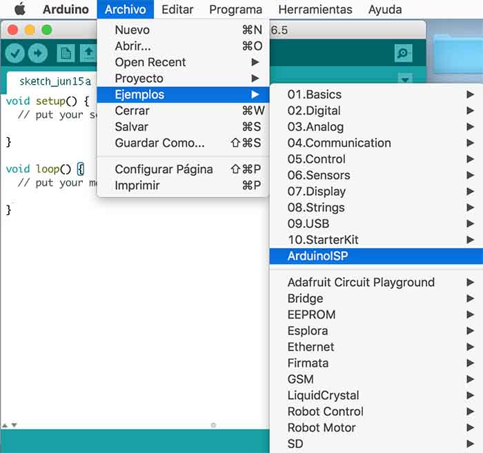 Then select your board, etc and important Arduino as ISP