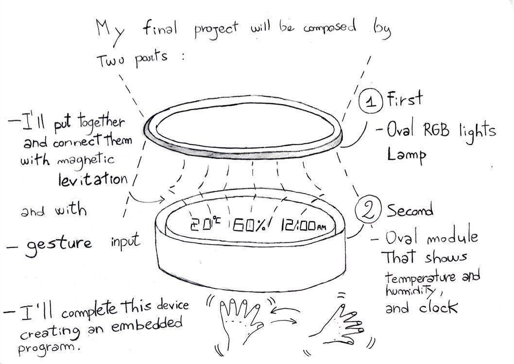 Obviously, I was searching for something new and useful: I started doing searches about general needs and different devices. I attemped studying and sketching wearable technology to keep warming, then hydroponic systems with remote control, and after solar powerbanks, furniture, and speakers. At the end, I realized there is already a lot about these type of devices … I immediatly looked for something new, full of tools, as a personal assitant, with lighting system and fascionating design; I decided that my final project will be about RGB LED lights, sensor of temperature and humidity, clock, and remote control. I like to image it as a dinamic device. I will name it “Spectrum”, and it will levitate. I had to keep working step by step due to the big number of tool to design and program.