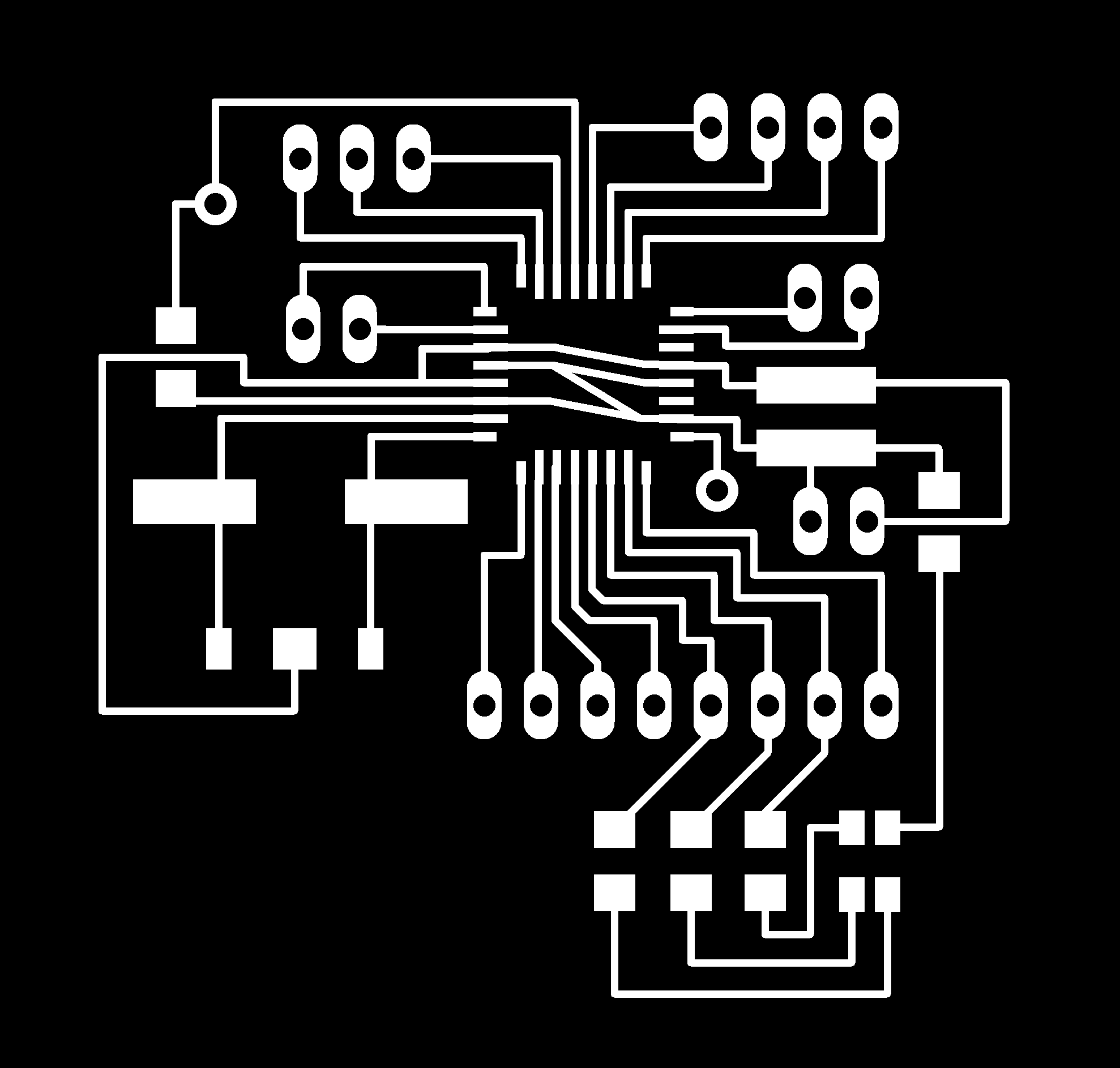 1st I generated .rml traces and .rml outline using Fab Modules. First I set a milling size of 1/64’‘ and a cut depth of 0,1 mm to make the traces, with 4 offsets.