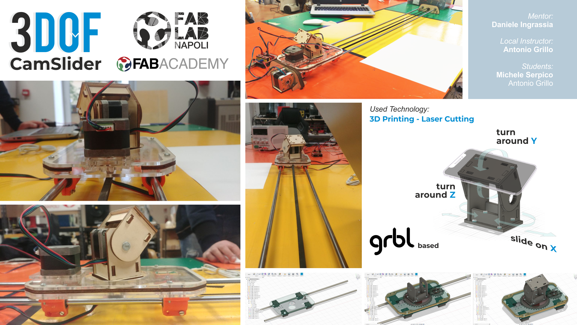 Finally, this week we actuated and automated our 3-DoF CamSlider; we made it through Arduino UNO + CNC Shield GRBL based and we had controlled the machine through Serial Port Monitor at first and than through GRBL Controller.
