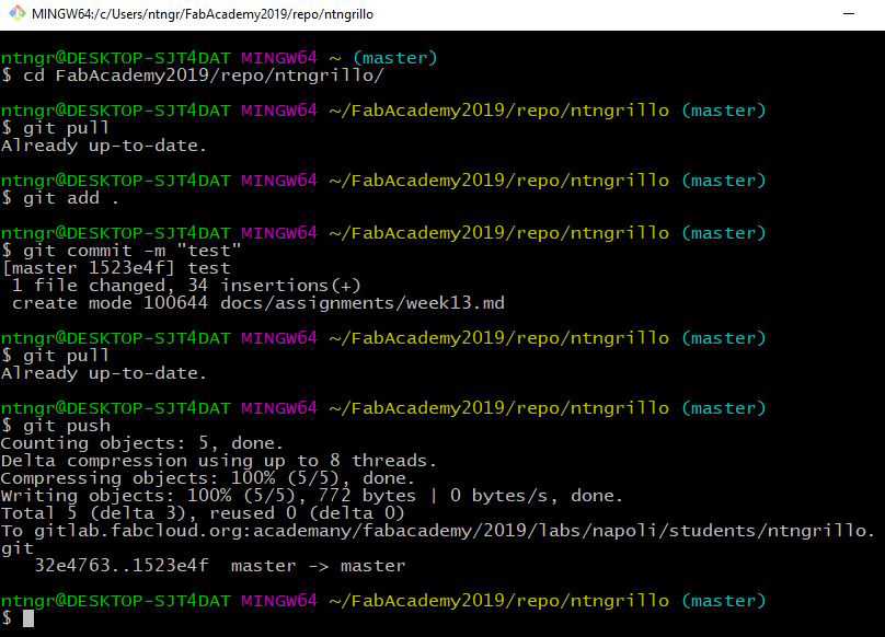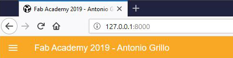 PS C:\Users\ntngr> bash ntngrl@DESKTOP-SJT4DAT:/mnt/c/Users/ntngr$ mkdocs --version mkdocs, version 1.0.4 from /usr/local/lib/python2.7/dist-packages/mkdocs (Python 2.7) ntngrl@DESKTOP-SJT4DAT:/mnt/c/Users/ntngr$ cd FabAcademy2019/repo/ntngrillo/ ntngrl@DESKTOP-SJT4DAT:/mnt/c/Users/ntngr/FabAcademy2019/repo/ntngrillo$ mkdocs serve INFO - Building documentation... INFO - Cleaning site directory [I 190127 11:08:43 server:298] Serving on http://127.0.0.1:8000 [I 190127 11:08:43 handlers:59] Start watching changes [I 190127 11:08:43 handlers:61] Start detecting changes [I 190130 11:09:12 handlers:132] Browser Connected: http://localhost:8000/assignments/week01/