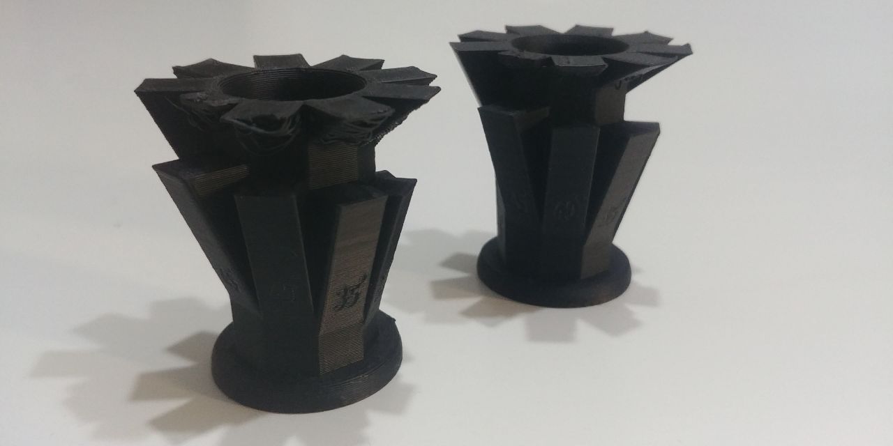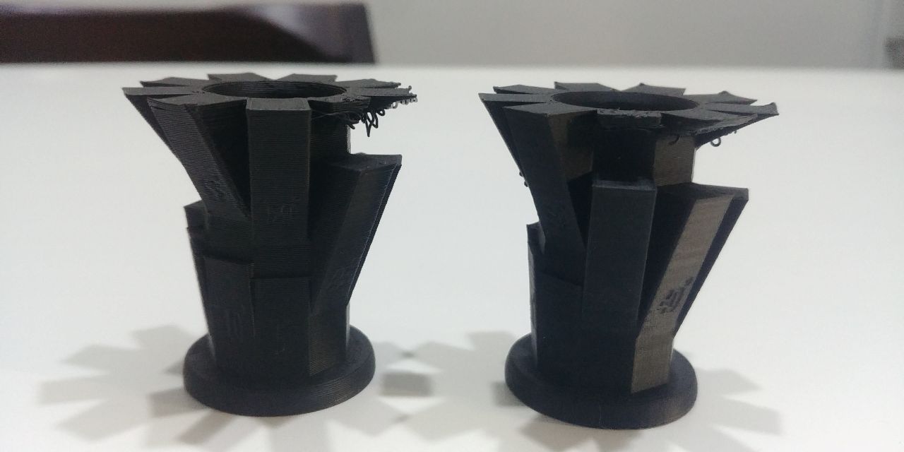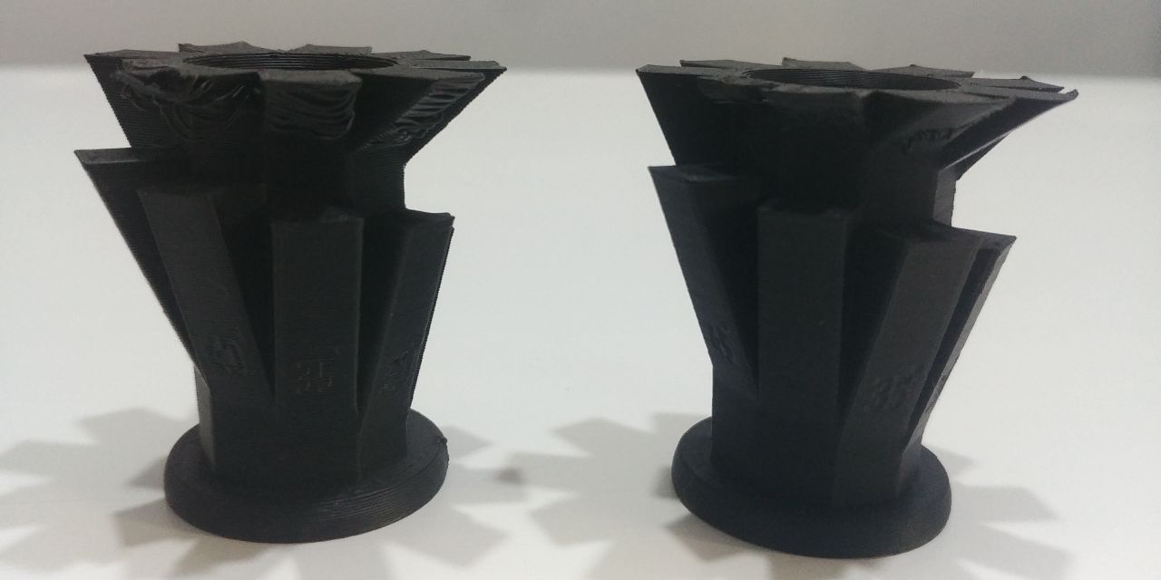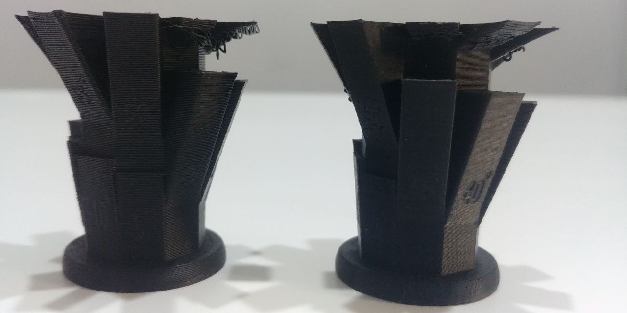 We did a “Overhangs not supported” test using the downloaded file and prepare two different Z-Codes to demonstrate how the layer height can influence the not supported pice with different angles.