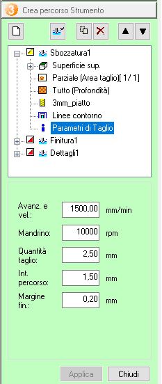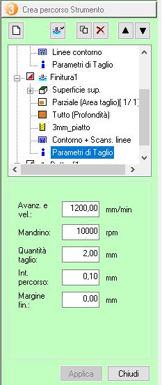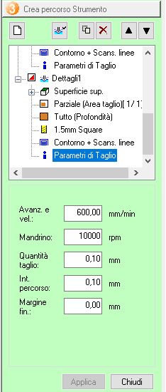 | Job n. | Job Type | Tool Type | Tool diameter (mm) | Cutting Speed (mm/min) | Spindle Speed (rpm) | Cut Depth (mm) | Offset (mm) | Finishing Margin (mm) |