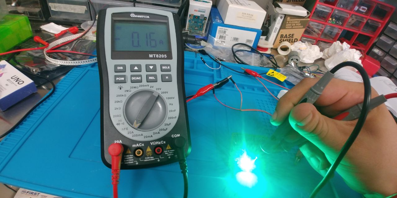 To do that I used a “MT8205” multimeter/oscilloscope 2in1. As you can see below the current value is 16mA for green cathode of the RGB led,