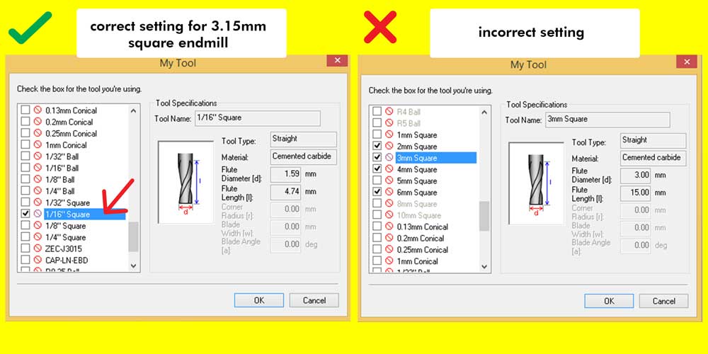In my case I was going to use 3 types of endmills: two square endmills one of Ø 4mm, and one of