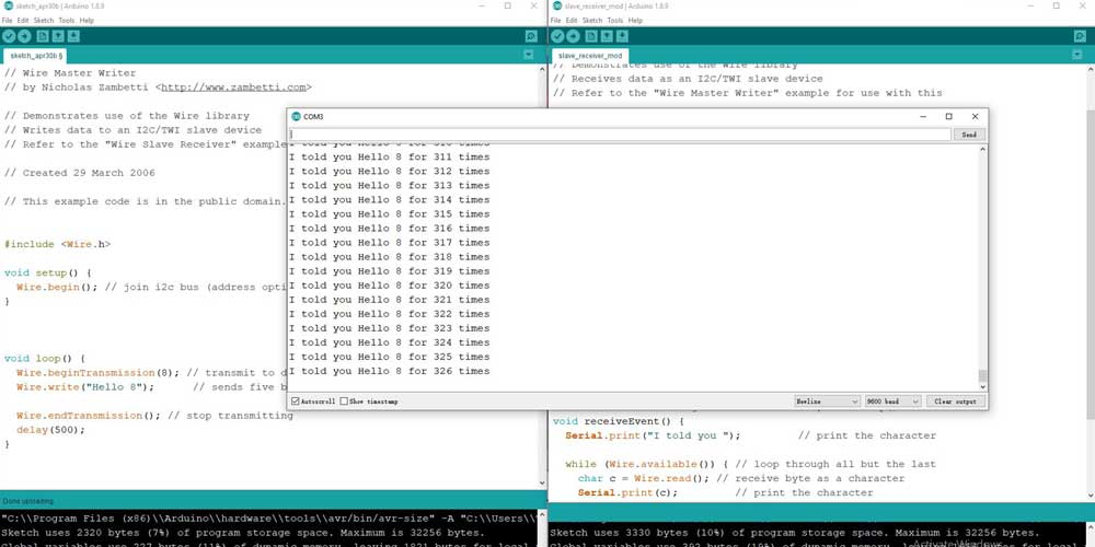 These series of photos show (from the left) the master's code, and the slaves serial monitor message that was displayed when uploading the codes and connecting them.