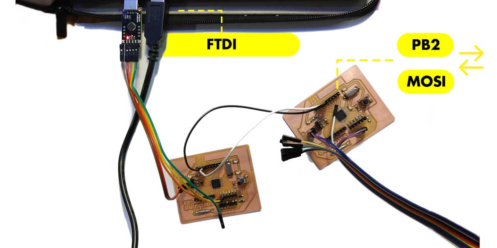 The connections are very simple, first upload the code and connect each board using an FTDI cable