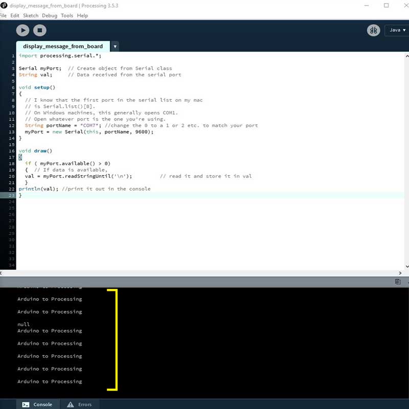 _2 The inside Processing IDE I have to write the code so that it listens what my board is trying to say.