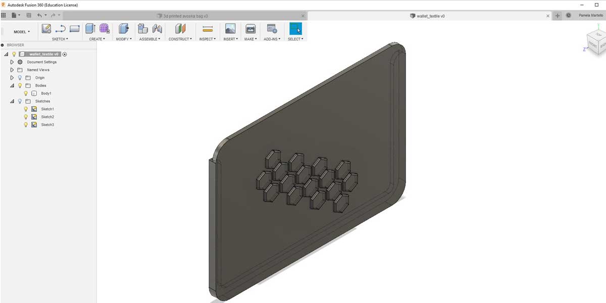 I designed the coin wallet using Fusion 360, and as you can see from the render the idea is to have the pocket that serves to hold the coins, made out of fabric. So my initial idea was to pause the print at a specific height, place the fabric and then continue the print the borders so that it would attach to the filament and create this pocket.