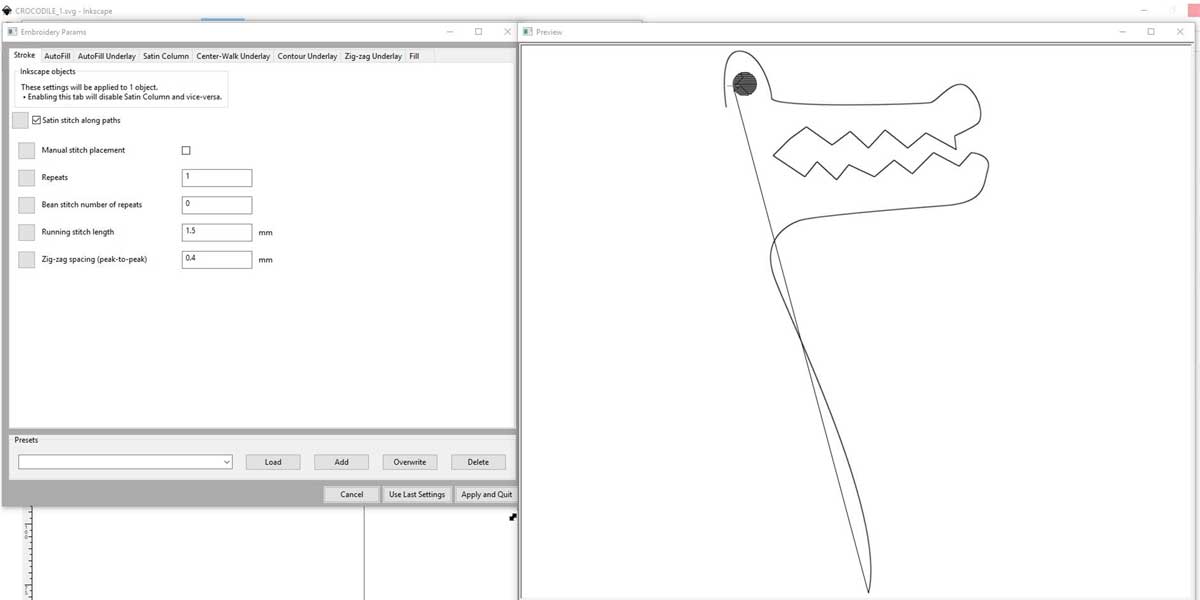 This extension is called INK/STITCH, and as I normally use Adobe Illustrator to create vector graphics, I thought this was a good excuse for me to try InkScape and generate my own vectors.