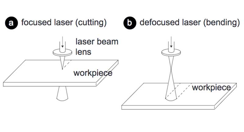 By defocusing the laser beam you heat an area (rather than cutting ir or engraving it) and this together with gravity will cause that the material starts to bend where the beam is burning.