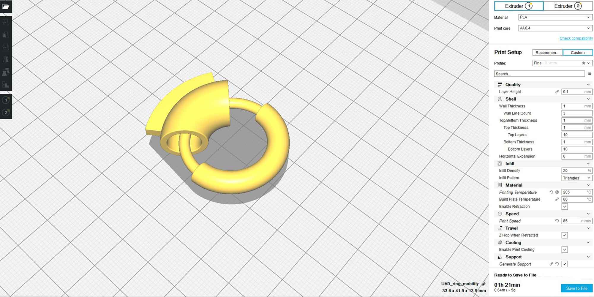 Once I had the settings for my print I did the first test using an ULTIMAKER 3 printer with PLA filament.