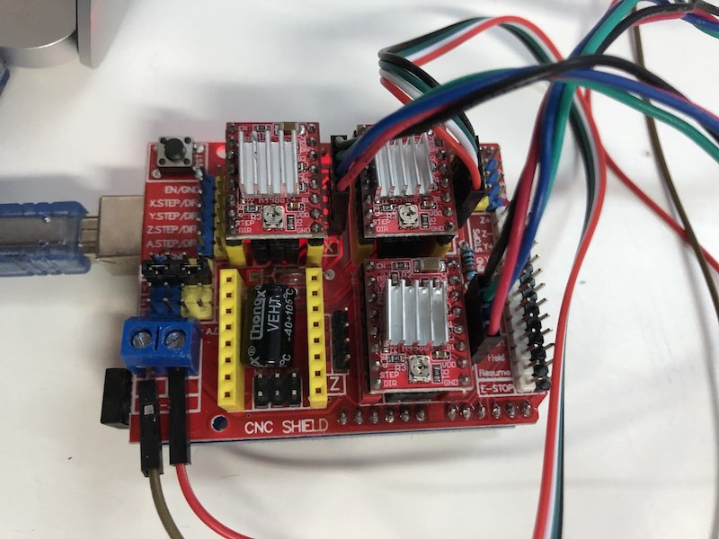 In order to understand how a xy plotter works, first we looked at the structures of existing plotter. We have one structure that moves in one axis. The stepper motor was connected to a threaded rod, with its pitches counting as steps. We uploaded GRBL, an opensource G-code interpreter for Arduino devices. A CNC shield was then pinned into the Arduino UNO board we were using. This GRBL compatible CNC shield can be used to support X, Y, Z and full axis. It runs on 12-36V DC, which means we had to plug the shield with a power supply. For each axis, there are two end stops, which allows the CNC to plot within the given area. Stepper Motors can be connected with 4 pin molex connectors or soldered in place.