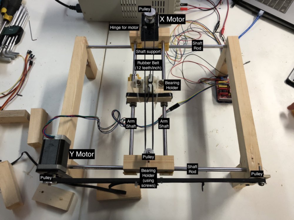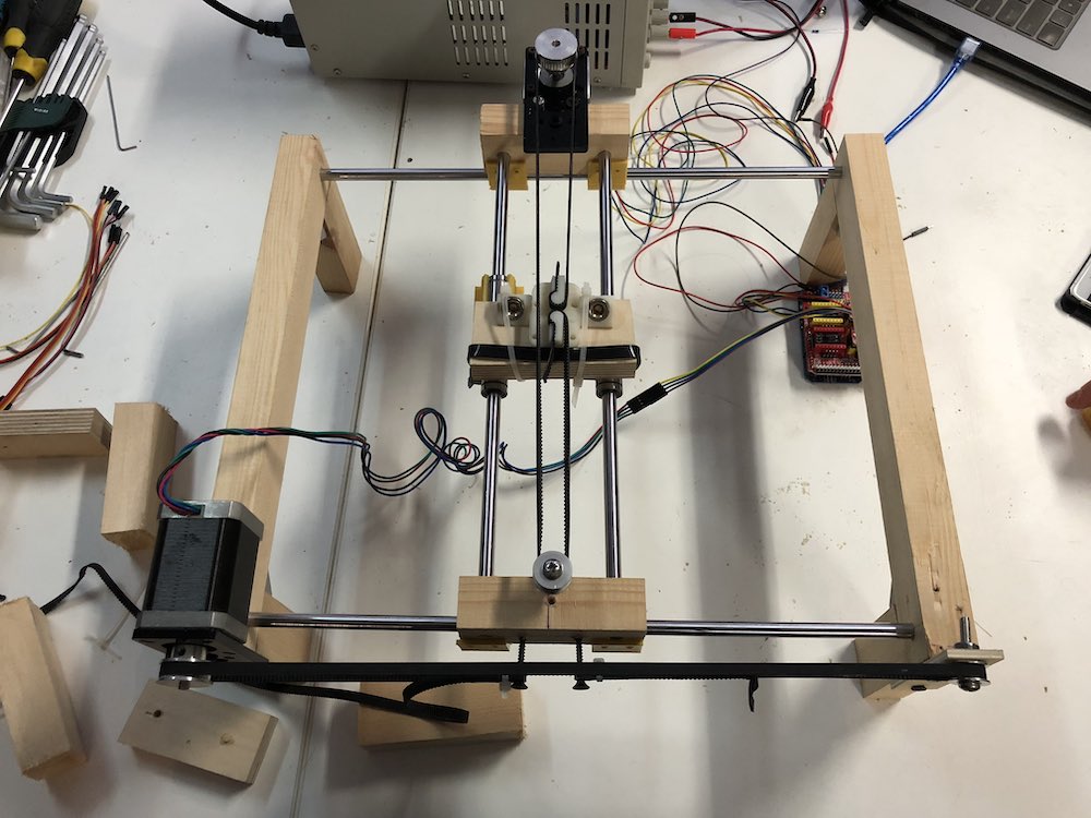 Understanding the basics, we took apart a vertical 3d printer at our lab and put it in place to function as a XY plotter.
