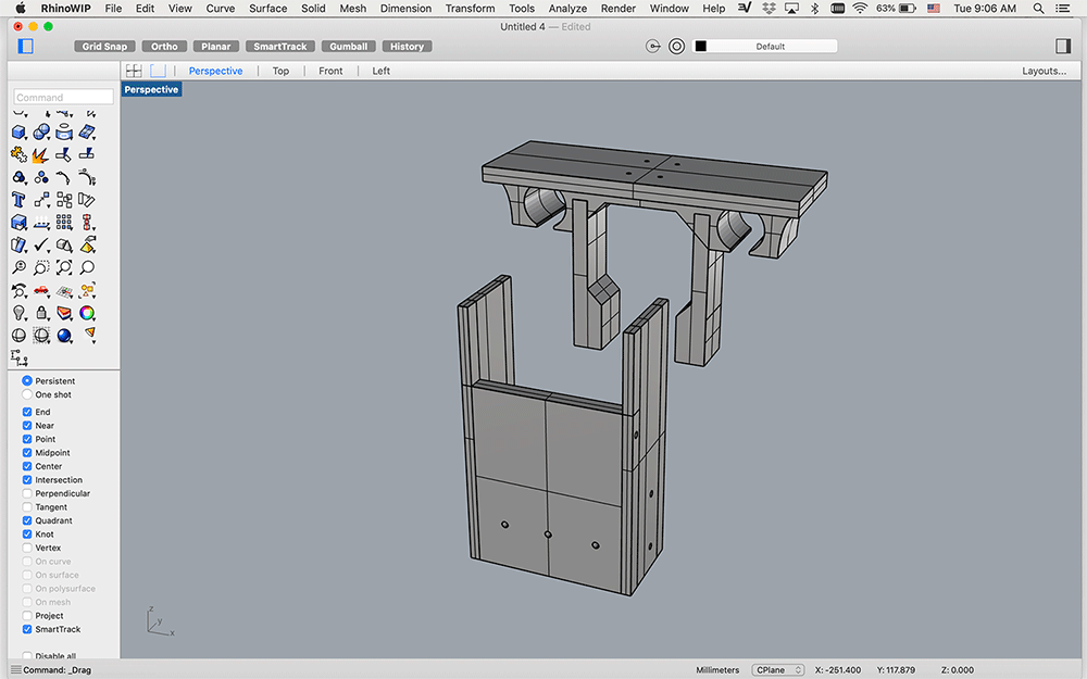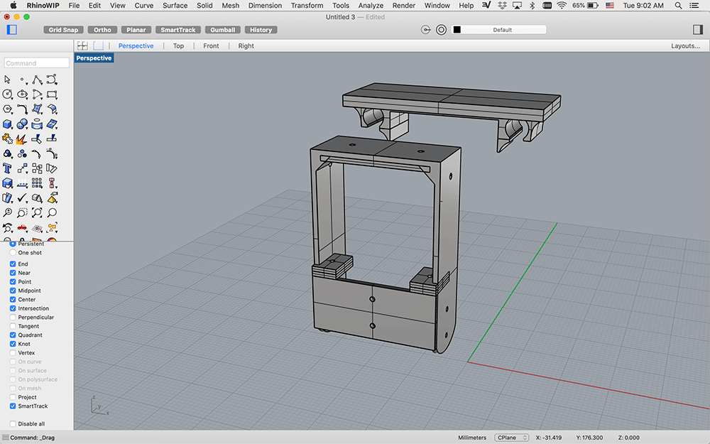 Since Nick was designing the shaft supports for the X axis, we had to agree upon some of the measurements our parts share, including the distance between the center of the shaft rod circle, the height of the support, etc. Afterward, I began to develop the part: