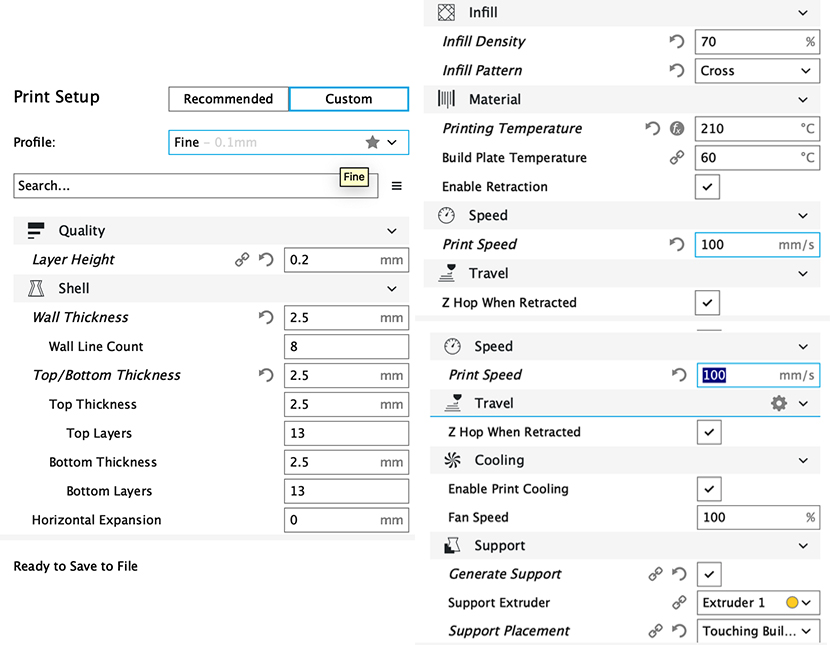 To ensure the parts are solid enough as a support, I adjusted the wall thickness of the components to 2.5mm. Here is the setting used to generate the gcode on Cura: