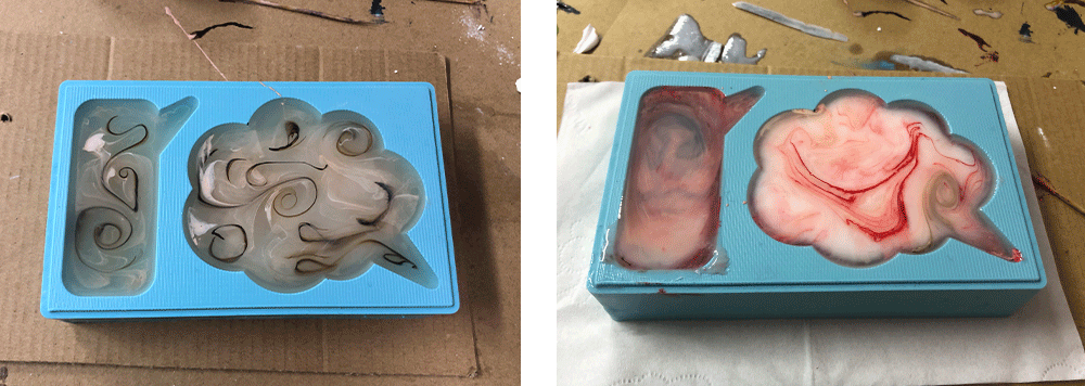 Once mixed together, the resin becomes solid very fast, in about 3 minutes. In that period of time I need to finishing pouring and coloring, which is challenging but fun. Since it is unable to see the bottom face of the cast, you can only guess and stir the color with little tooth stickers.