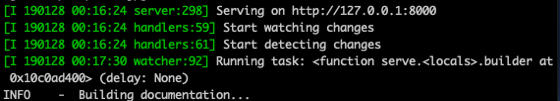 MkDocs comes with a built-in dev-server that lets you preview your documentation as you work on it. You should be in the same directory as the mkdocs.yml configuration file, and then start the server by running the mkdocs serve command. The output of this command is shown below: