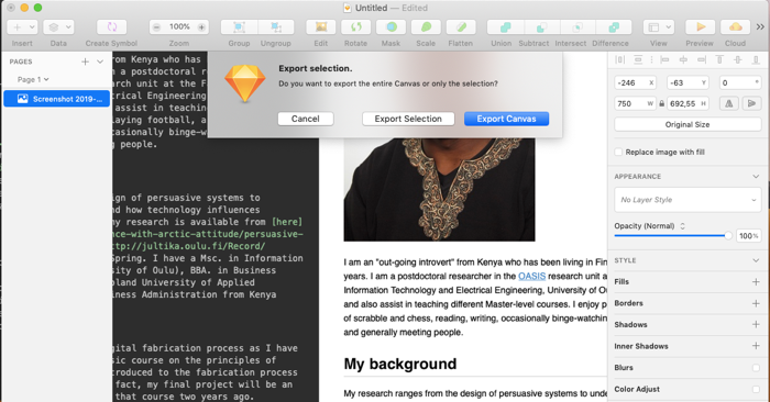 As the files we upload to Fabcloud should be light and suitable for the Web, I chose to use Sketch for compressing the images and optimising them for the Web. Later on or if needed I might also consider using ImageMagick which Neil introduced during this week’s lecture. Iván Sanchez Sanchez also showed us how to use it during our local lecture. It is easy to resize an image with Sketch. You just open the file in Sketch, resize it, then click on export selection and choose a location to save the file. Not sure, though, whether the file sizes are small enough so might have to still compress them later.