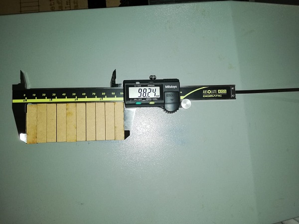 To calculate the kerf, our team designed in Autocad a rectangle with 11 cuts, creating 10 small rectangles, then, the kerf was calculated in the following way: The length of the rectangle, minus the length of the pieces that were cut, divided by the number of cuts and then divided by two