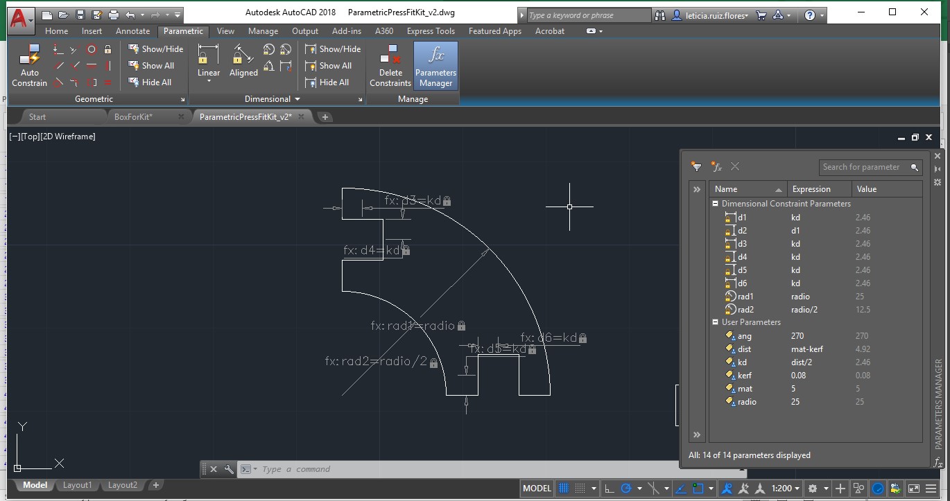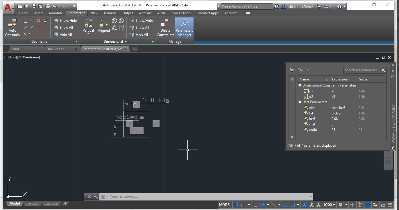 - Set your basic user parameters early on, such as material(mat), kerf, radio, distance for single cut with kerf allownace (dist) and distance for press fit with kerf allowance (kd). The names in parenthesis are the ones I sued but you can define your own