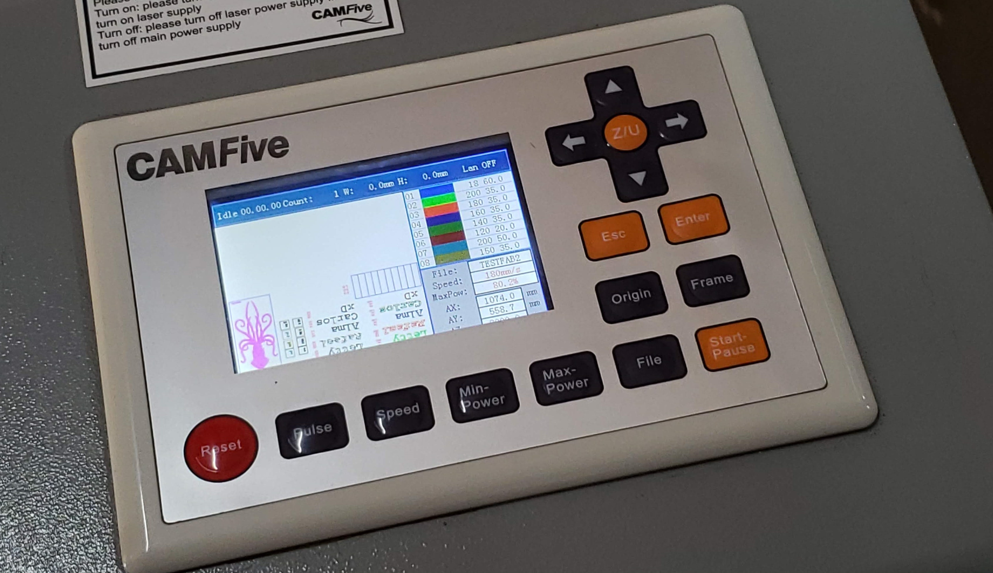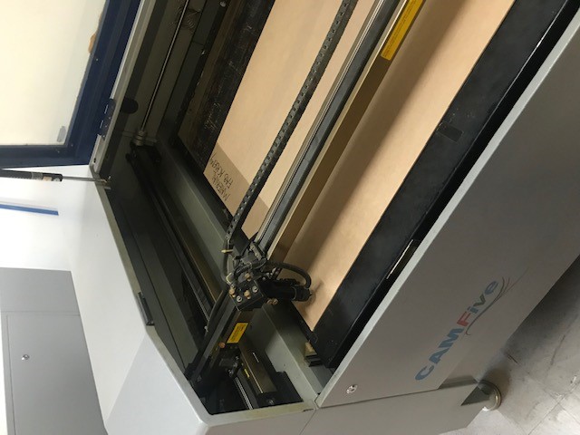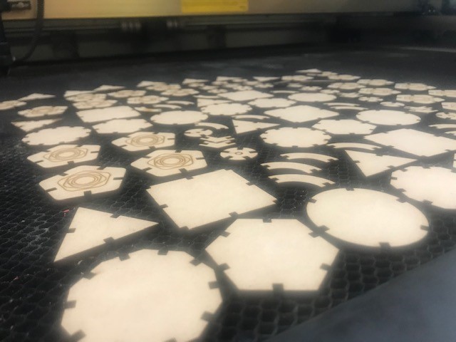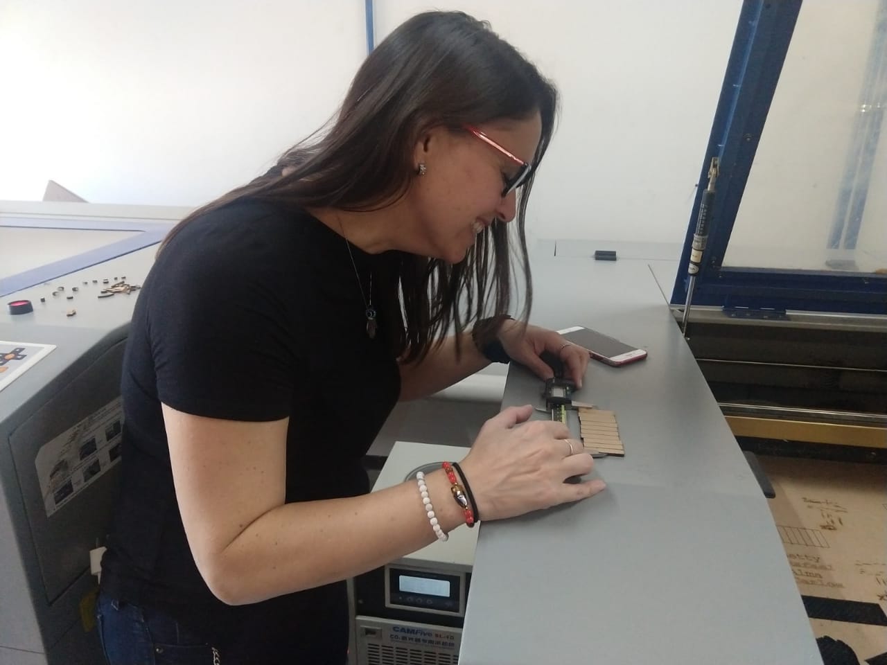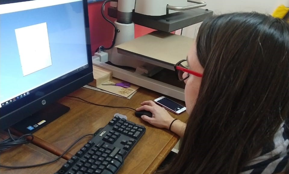 The file is opened in the lasercutting equipment via a usb, identifying the correct origin point so the complete file is cutted and/or engraved is critical for the project's success. Our lasser cutting equipment has a buckling on the cutting table, so its best to cut small files at a time and move the material to fit where it's at its best.