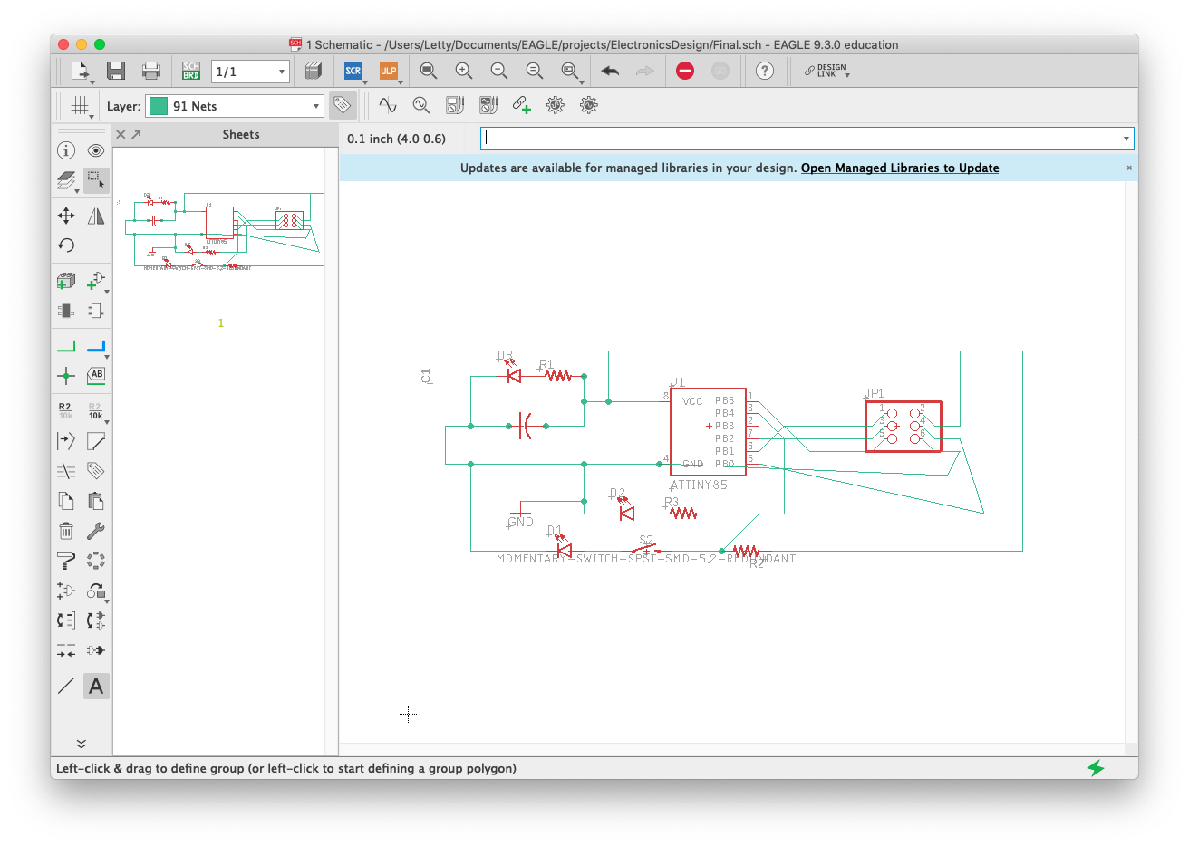 - Define components to be used: three LEDs, three resitors, one capacitor, one tiny45 microcontroller, 6 pin piece, one push button.