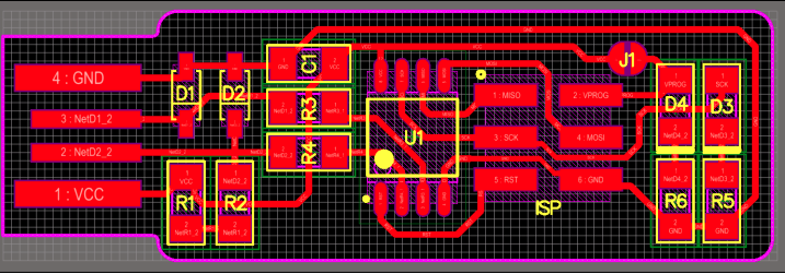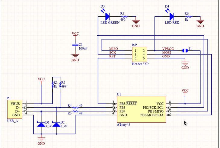 1x ATtiny45 / 2x 1Kohm resistors / 2x 499Kohm resistors / 2x 49Ohm resistors / 2x 3.3v Zener diodes / 1x red LED / 1x green LED / 1x 100 nF capacitor / 1x 2x3 pin header / As mentioned above I have some knowledge in soldering although the packages I used to solder are not SMD, The SMD packages are tiny and are soldered on the surface.,So I based my self on the details that are in Brian's link