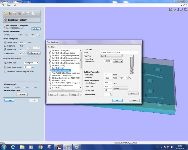 Some info on Vectric Cut 3D: there are several parameters to insert and two different files to save. In fact the first part of the work will be roughing (and in our case the 1/8 tip will be used) while the second part is finishing (smaller tip, 1/16).