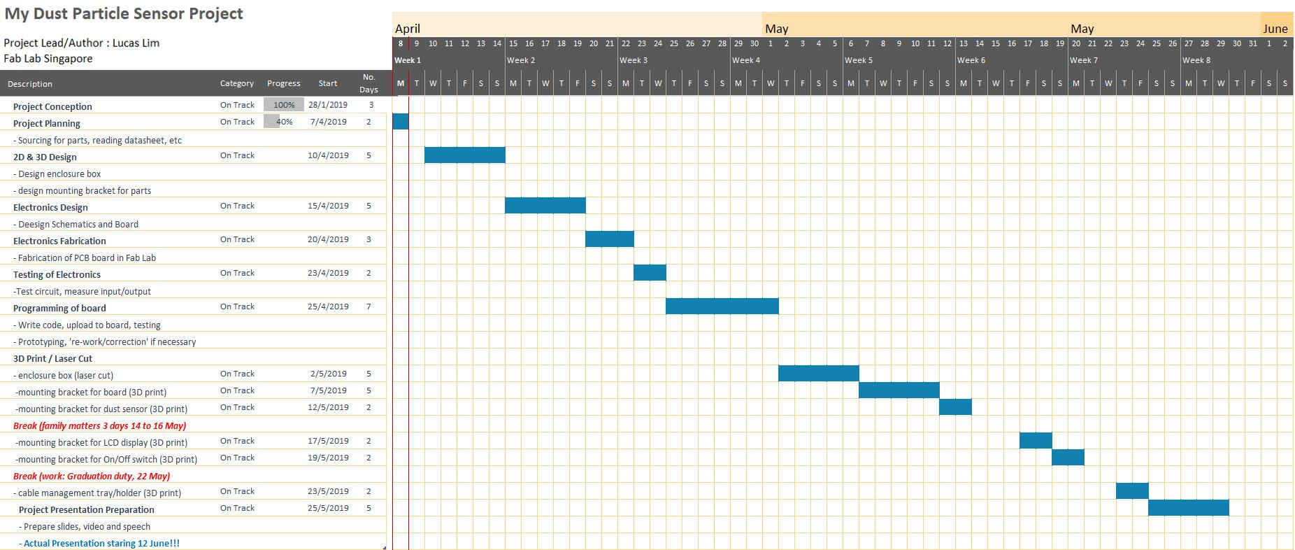 In week 1, I thought of making something useful and decided to make a dust particle sensor for my Project Lab (a carpentry workshop), but as I am new to electronics, I only started planning in week 12 (7th April 2019), 'Output Device' week.