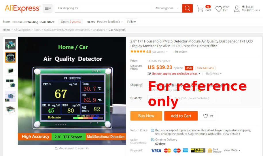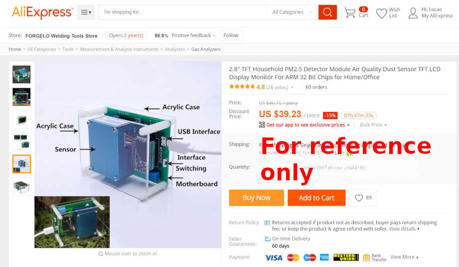 I had came across this "PM 2.5 dust detector with 2.8" TFT LCD display" which costs US $39.23.