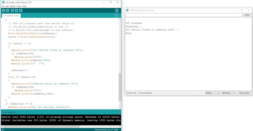 2) Then I followed this guide and run the 'I2C Scanner' sketch to find the I2C address of my I2C interface. My LCD I2C address is '0x3F'.