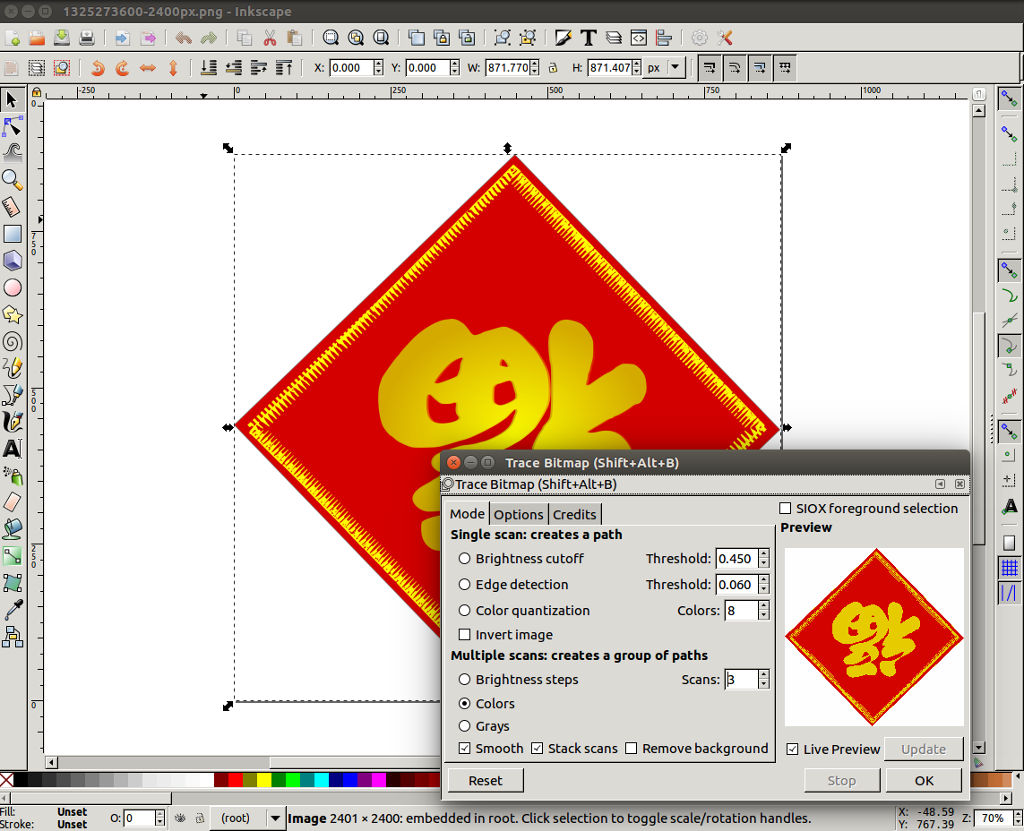 2. Then I used the "Trace Bitmap" function in Inkscape to convert the bitmap image (which is in .png file format) to vector graphic. For the "Trace Bitmap" setting, I had set to "Colors" Mode, and number of scans to only 3 passes instead of the default "8" as I wanted only 3 colours from the graphics.