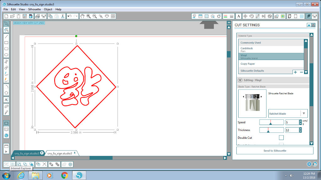 4. Test cut to determine 'knife' selection, cut setting and ability to cut to a sufficient depth of the vinyl media by simply drawing a small little "test" box and cutting that shape out. It should not cut all the way through the vinyl sheet but deep enough to be able to peel out the cut shape.