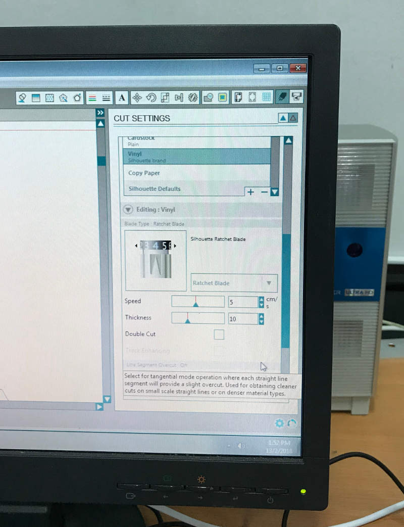 5. From the test cut, I changed the knife selection from number "2" to number "4" (a thicker cutting tip) as the vinyl media is a bit too thick and require the use of a thicker cutting tip.